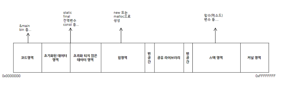 - data 영역 전역변수, static variable들이 저장됨. 숫자나 문자열 값인 리터널(소스 코드의 고정된 값 ex) int i = 1; 의 1을 의미)도 저장