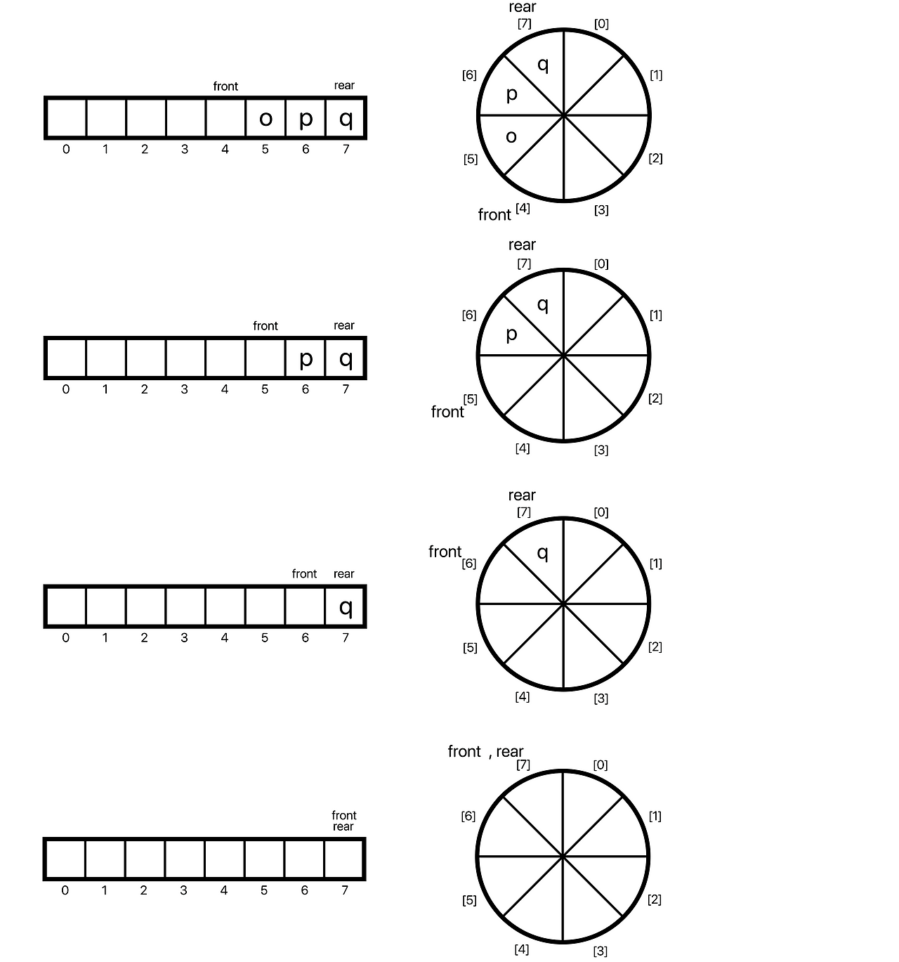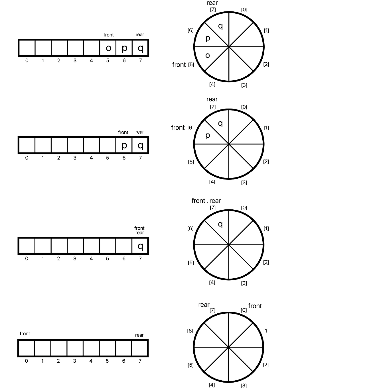 이런 문제를 해결하기 위해 front가 가리키는 인덱스는 실제 첫 데이터를 가지고 있는 index보다 한 칸 앞에 있도록 구현해야한다.